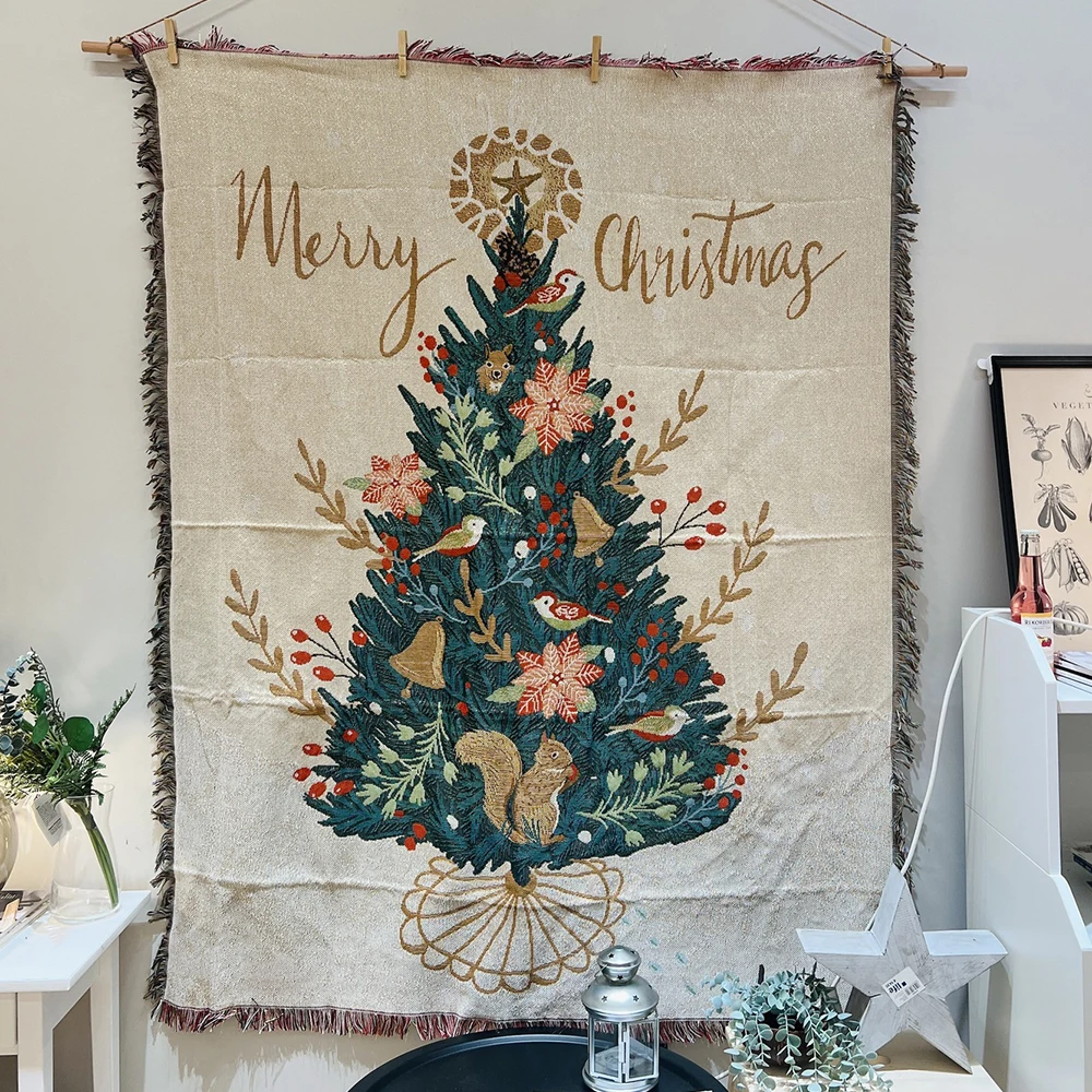 Perfect for snuggling up during chilly holiday evenings, this blanket adds a touch of nostalgia to your home decor. Use it as a throw on your couch or drape it over a chair for added warmth and charm. The woven edges ensure durability and longevity, making it a timeless addition to your holiday collection. Spread the joy of the season with our Christmas Tree Tapestry Throw Blanket!